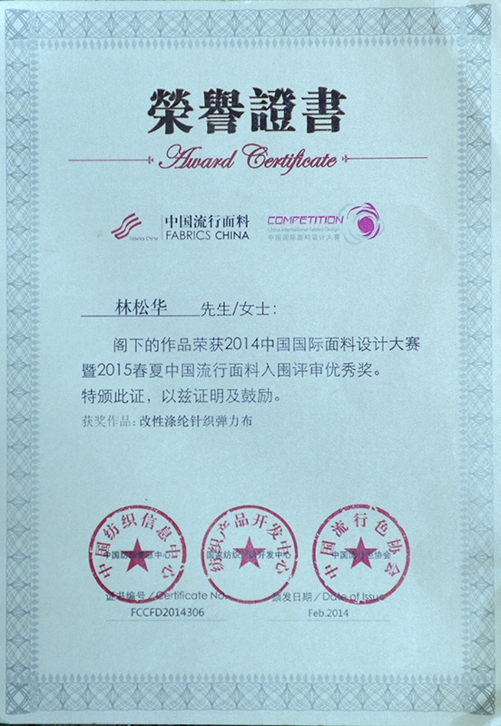印染行業(yè)優(yōu)秀面料獎一等獎